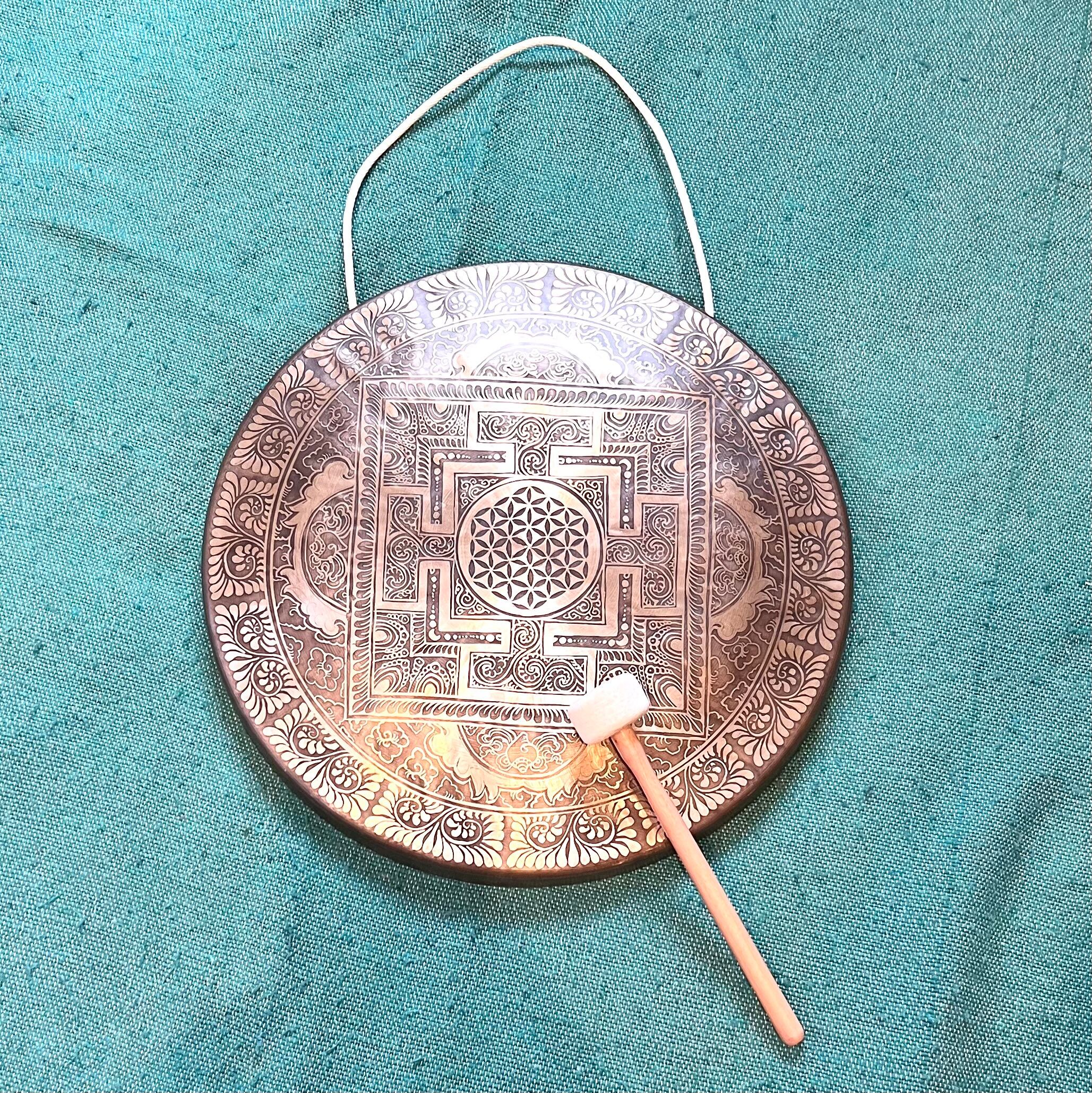 インドや中国製も多いですが、ネパール伝統のメタル配合にカービングを施した優しい音のゴングです。