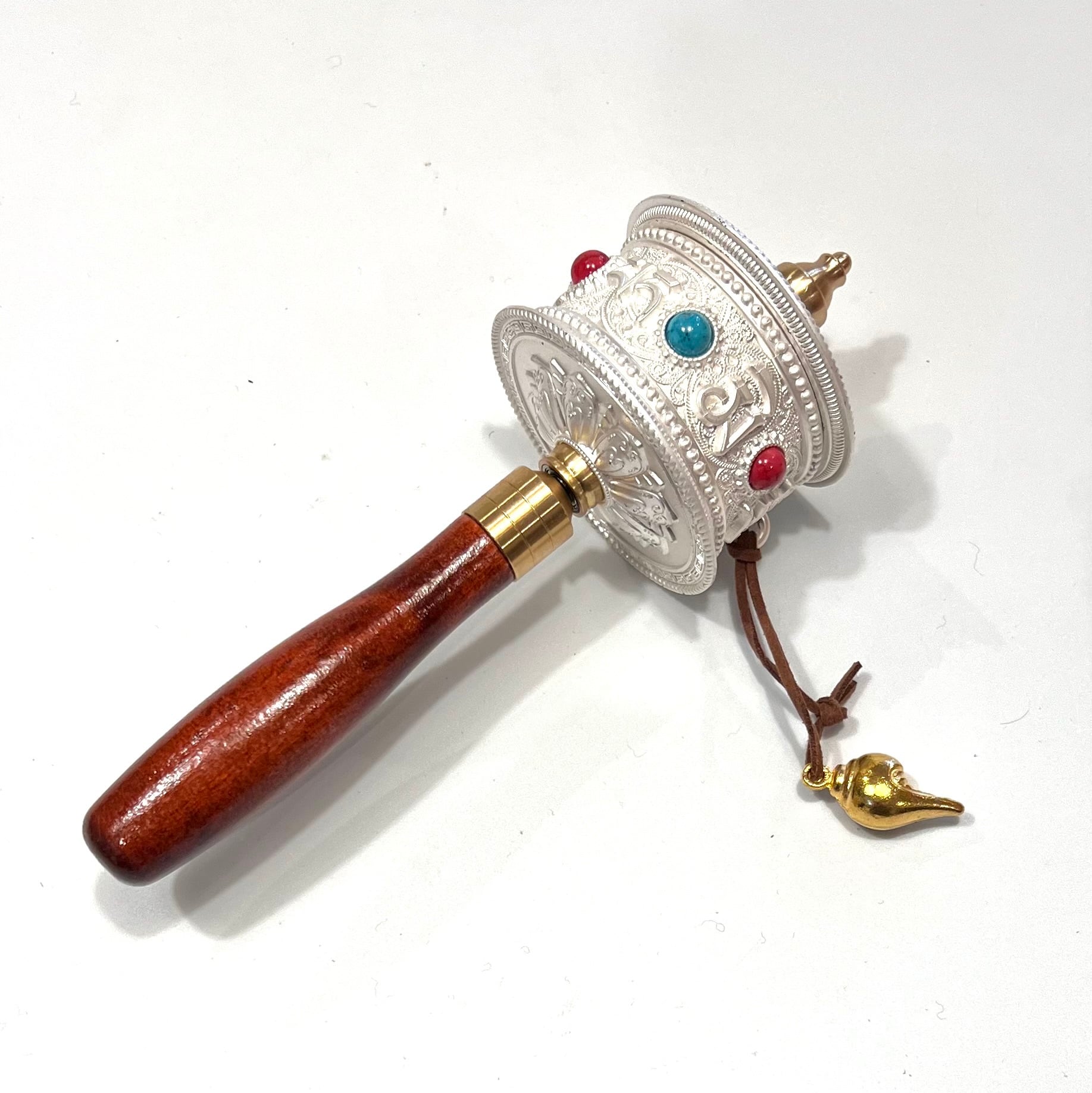 チベット・拉薩のポタラ宮近くの仏具店で購入したマニ車(まにぐるま)というチベット仏教の仏具で、筒の外側にはオムマニペメフムの六字真言と五つの石が装飾されています。中には真言の巻物が入っていて、時計回りに回して、回転した数だけお経を唱えるのと同じとされ、ご利益があるというありがたい道具です。